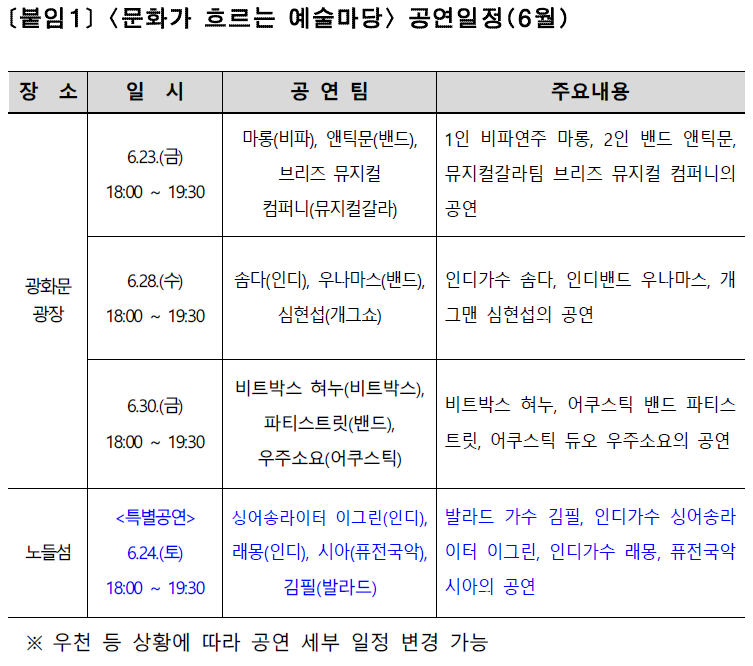 <문화가 흐르는 예술마당>은 이번 특별공연 이후에도 재즈, 국악, 팝페라 등 다채로운 공연으로 시민들의 일상을 가득 채울 예정이다. 평일(수,금)의 공연 관람을 원하는 시민은 광화문광장으로, 특별한 주말을 보내기를 원하는 시민들은 노들섬으로 향하면 된다.