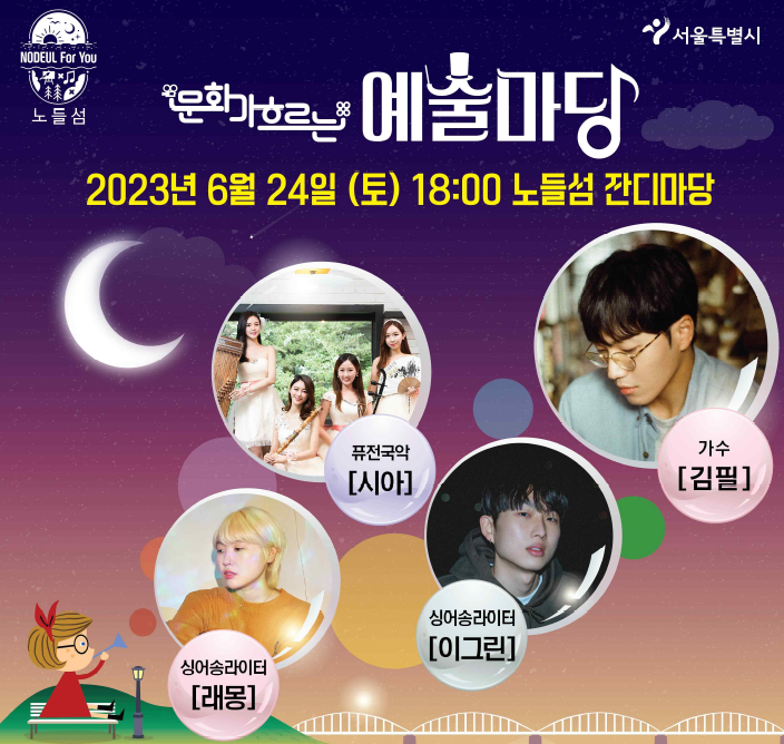 서울시 대표 시민향유형 공연 사업인 <문화가 흐르는 예술마당>이 6월 24일(토) 18:00~20:00 노들섬에서 두 번째 특별 공연을 개최한다. 이번 공연에는 발라드 가수 ‘김필’, 퓨전국악 그룹 ‘시아’, 인디보컬 ‘래몽’, 싱어송라이터 ‘이그린’ 이 참여하여 노들섬을 여름날의 감성으로 물들일 예정이다.