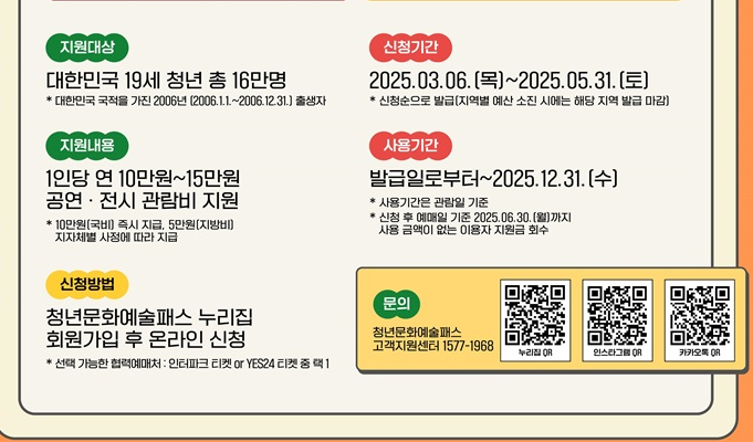 문화체육관광부는 한국문화예술위원회와 협력하여 올해 19세에 해당하는 2006년생을 위한 '청년 문화예술패스'를 최대 15만 원까지 지원한다고 24일 발표하였습니다.