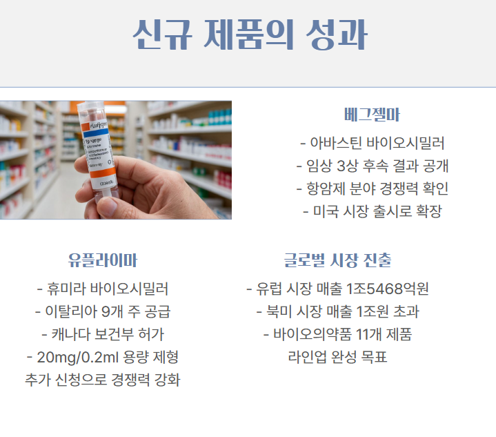 작년 한 해 동안 램시마 외에도 유플라이마, 베그젤마 등의 신규 제품이 모두 연간 최대 매출을 경신하며 총 3조1085억원의 매출을 기록했다. 특히 유럽에서의 연 매출은 1조5468억원에 달하며, 북미에서도 연 매출이 1조원을 초과했다.