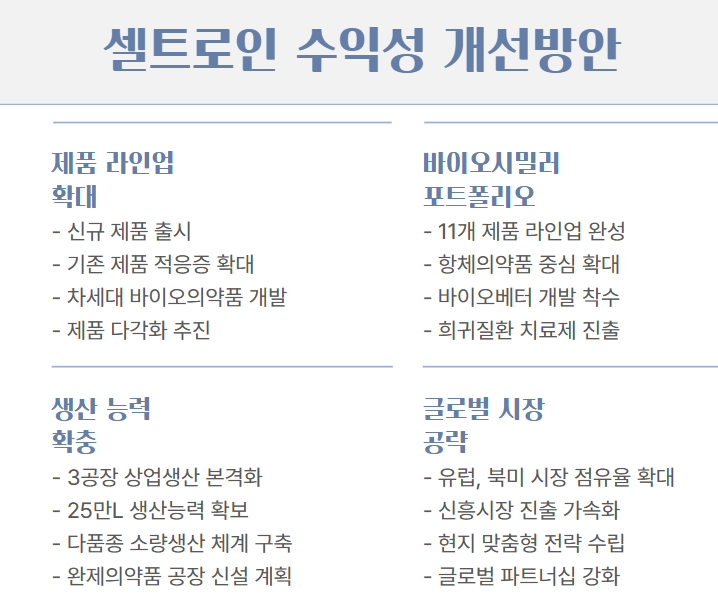 셀트리온은 올해 제품 라인업을 확대하고 매출 증가를 기대하고 있으며, 바이오의약품 11개 제품의 라인업 완성을 통해 연매출 5조 원 달성을 목표로 하고있다.